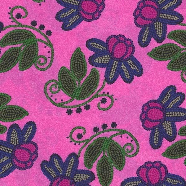 This cotton fabric features beadwork-inspired florals with curling vines and dotted details, celebrating growth, community, and cultural storytelling in a pattern that feels lively and timeless. Lightweight yet versatile, it is perfect for ribbon skirts, regalia accents, powwow accessories, and star quilts, while also lending itself beautifully to tote bags, table runners, and wall hangings. Sold by the half yard; multiple quantities are sold in one continuous cut. Pre-wash and dry before sewing to prevent shrinkage. Machine wash cold with like colours; tumble dry low; warm iron.