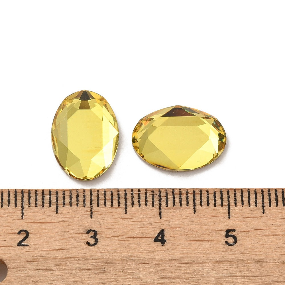 Description: Glass faceted rhinestone cabochons. Flat back and back plated. Used for making beaded earrings, pendants, and more. This item measures 14mm long x 10mm wide x 3.5mm thick.