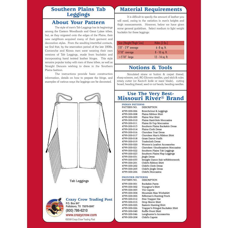 Description: Leather Tab Leggings became popular with Comanches and Kiowas by the late 1800's and they continue to be worn today by these tribes and other Southern-style Straight Dancers. Not only does our product provide patterns in men's sizes, but it includes highly illustrated and detailed instructions on how to completely make this distinctive type of legging.