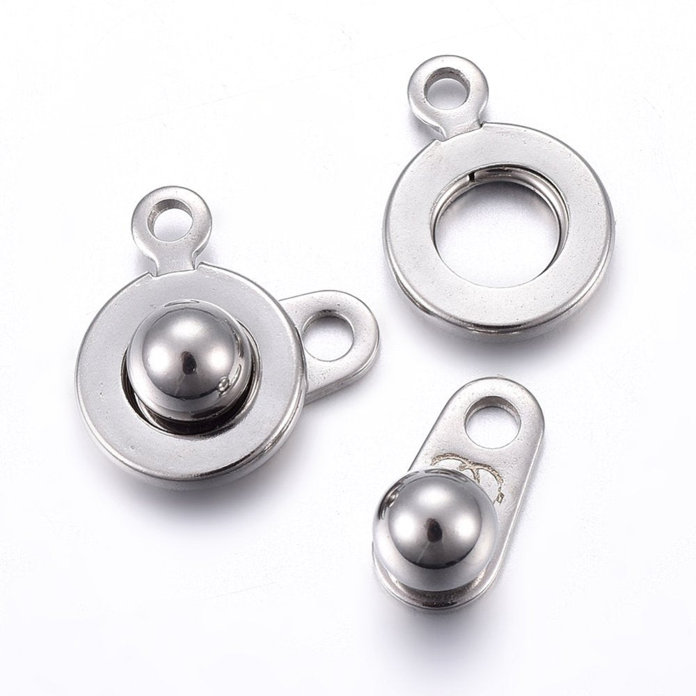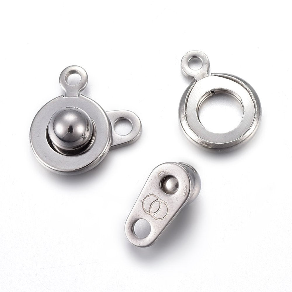 Description: Trailer hitch style button clasp. Easy on/off with a secure closure. Small size for bracelet and lightweight necklace designs. Size: about 9mm wide, 15mm long, 5mm thick, 1.5~1.8mm. 201 Stainless Steel Snap Clasps.