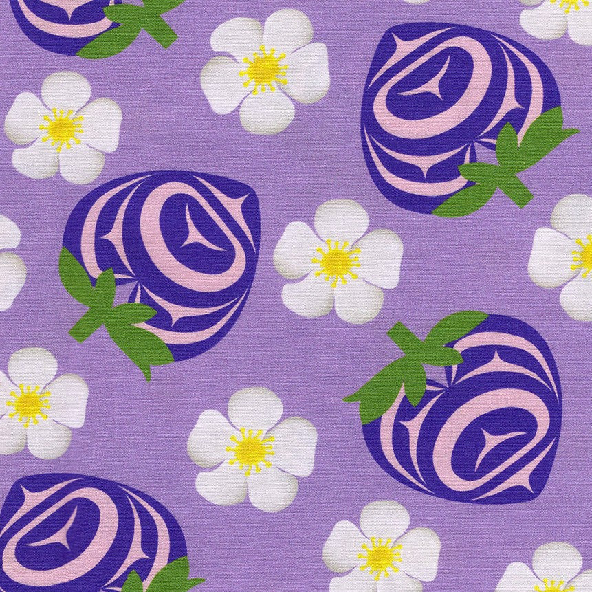 This cotton fabric features graphic strawberries and blossoms interpreted through Northwest Coast formline curves, creating a cheerful, modern pattern with deep cultural roots and a sense of abundance. Lightweight yet versatile, it’s perfect for ribbon skirts, regalia accents, star quilts, and shawls, while also lending itself beautifully to tote bags, table runners, and wall hangings. Sold by the half yard; multiple quantities are sold in one continuous cut. Pre-wash and dry before sewing to prevent shrinkage. Machine wash cold with like colours; tumble dry low; warm iron.