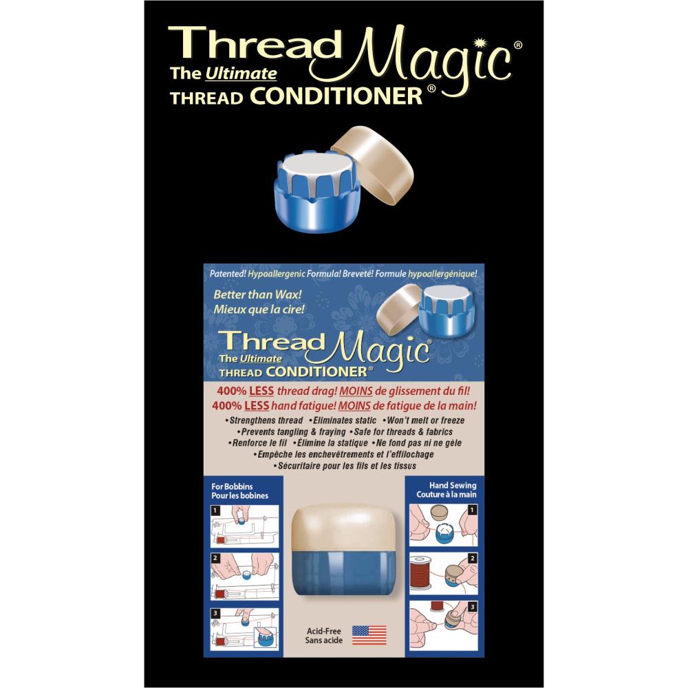 Thread Magic is a thread conditioner. Designed to make thread more manageable; it reduces friction when sewing; protects against UV rays, mold and mildew; and helps reduce tangling and knotting. Thread Magic can be used for hand or machine sewing. Acid-free and non-toxic.