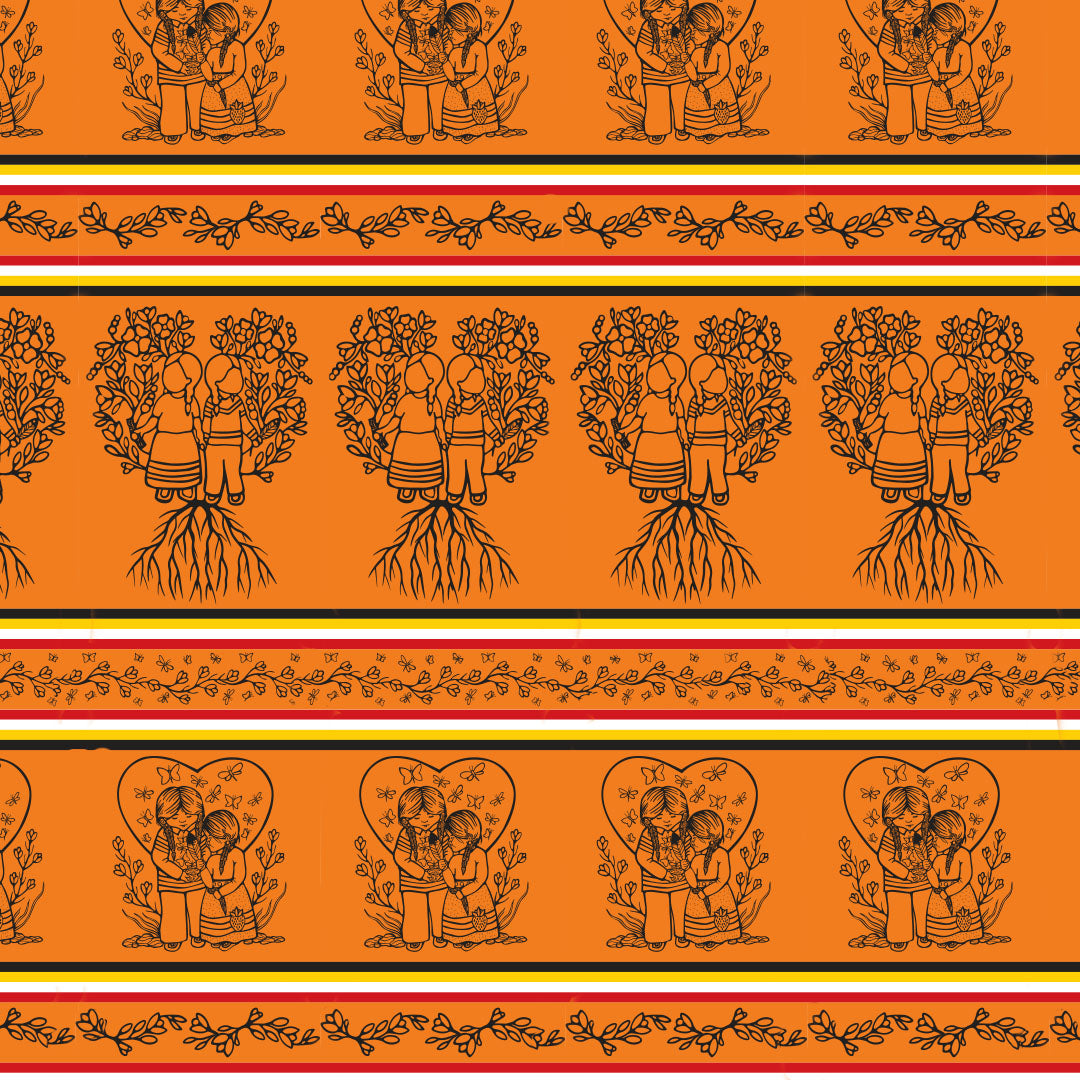 This cotton fabric features a narrative border composed of Jackie Traverse’s paired drawings: siblings standing together with medicine and an eagle feather in prayer, and children sheltered within a living tree with deep roots—imagery created to acknowledge Truth & Reconciliation and invite awareness, forgiveness, and healing. Ideal for ribbon skirts and garments where a placed border shines, it also lends itself beautifully to star quilts, shawls, tote bags, and wall hangings. Sold by the half yard; multiple quantities are sold in one continuous cut. Pre-wash and dry before sewing to prevent shrinkage. Machine wash cold with like colours; tumble dry low; warm iron.