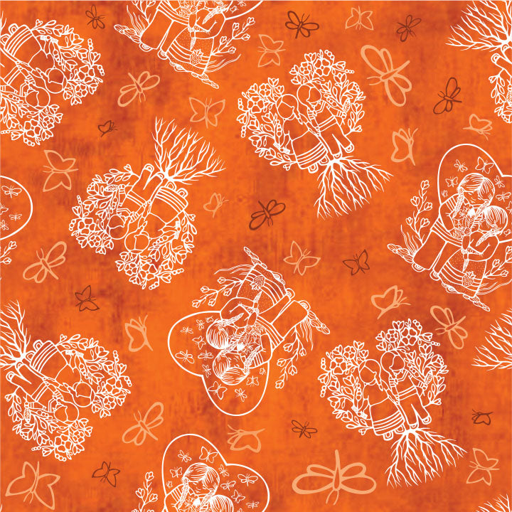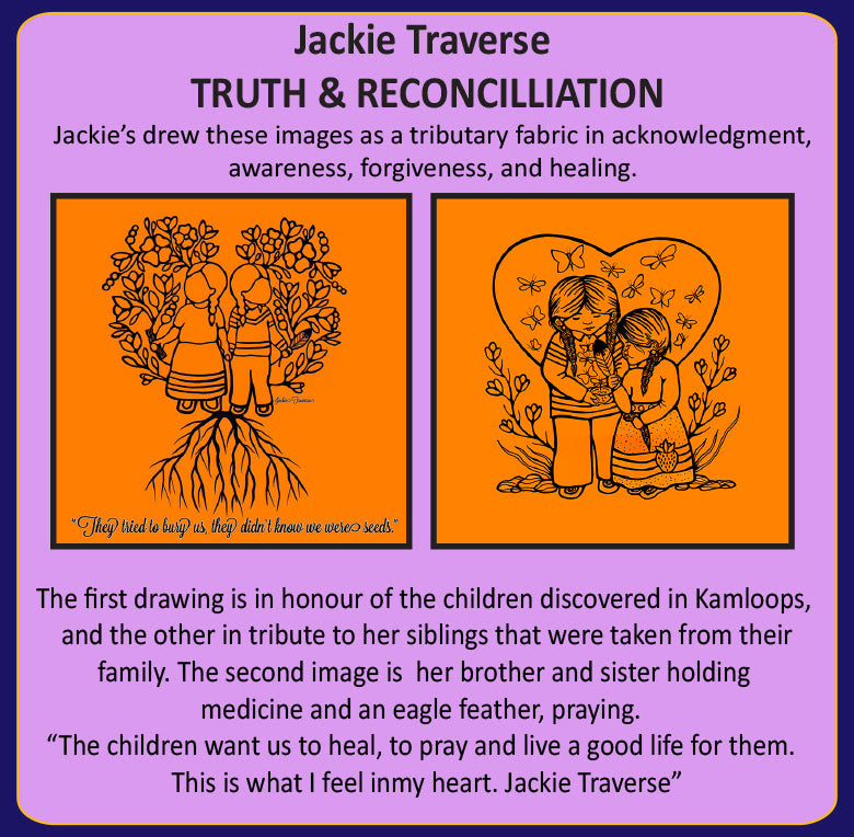This cotton fabric features an allover motif from Jackie Traverse’s Truth & Reconciliation tribute: children embraced within heart-shaped boughs, rooted trees, and butterflies, echoing “They tried to bury us, they didn’t know we were seeds” to honor remembrance, growth, and healing. Lightweight yet versatile, it is perfect for ribbon skirts, regalia accents, star quilts, and shawls, while also lending itself beautifully to tote bags, table runners, and wall hangings that keep the message present. Sold by the half yard; multiple quantities are sold in one continuous cut. Pre-wash and dry before sewing to prevent shrinkage. Machine wash cold with like colours; tumble dry low; warm iron.